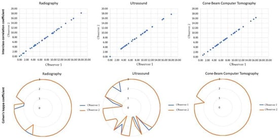 The observers’ agreement regarding the qualitative evaluation of periapical lesions was assessed via Cohen’s kappa coefficient, whereas quantitative evaluation was assessed via the interclass correlation coefficient.