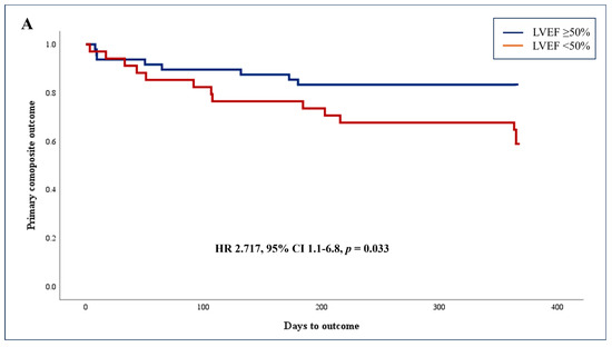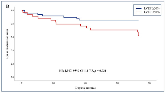 Data were available for the entire cohort with no censored cases. The composite outcome, including 1-year mortality and readmissions for cardiovascular causes, was documented in a total of 22 (26.8%) patients, including 2 cases of in-hospital mortality and 20 cases of cardiovascular-related readmissions. The mortality cases comprised of a male patient with AI-based preserved LVEF presenting with leukemia-related pulmonary embolism and a female with AI-based reduced LVEF and an urgent sternotomy for valve replacement with surgery-related complications. Figure 2 presents the Kaplan–Meier curves of the cumulative incidence of the primary composite outcome at 1 year. The unadjusted rates of the composite outcome were higher among patients with AI-based reduced vs. preserved systolic function (41.2% vs. 16.7%, p = 0.020; Figure 2A). Similar results were shown when analyzing the rate of 1-year cardiovascular-related readmissions (38.2% vs. 14.6%, p = 0.019; Figure 2B).