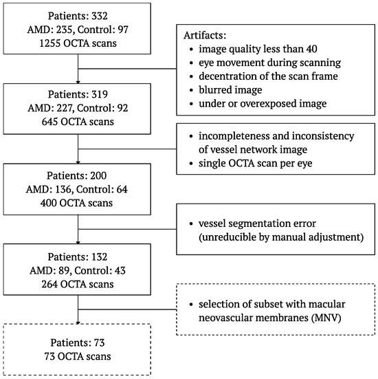 - Bontzos, G.; Kabanarou, S.A.; Garnavou-Xirou, C.; Gkizis, I.; Kontou, E.; Triantafyllou, D.; Xirou, T. Segmentation errors and motion artifacts in OCT-A associated with epiretinal membranes. Can. J. Ophthalmol. 2020, 55, 293–300. [Google Scholar] [CrossRef] [PubMed]