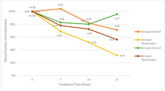 Mean wound surface area reduction comparison between overall and responder groups.