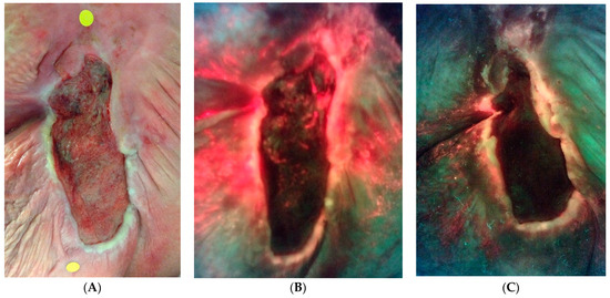An example of bacterial fluorescence at the time of enrollment after failed negative pressure. (A) Standard image. (B) Fluorescence image with extensive bacterial fluorescence. (C) Reduction in ulcer surface area and marked reduction in bacterial fluorescence at 4 weeks.