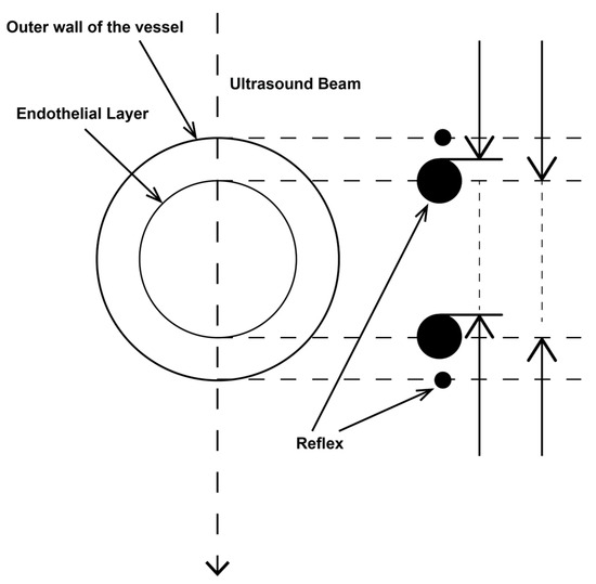 Determining the vessel diameter to calculate blood flow is a critical issue, especially for very small vessels such as the AHP. Inaccuracies are squared when calculating the cross-section. The AHC should be measured after leaving the truncus, when the vessel course is straight for the first time. The diameter of the AHP can be measured either from the upper abdominal cross-section or from the intercostal view. Since the Doppler profile from the intercostal view is favorable, but the vessel diameter sometimes cannot be effectively captured in this location, the vessel diameter can also be captured in the upper abdominal cross-section, just before the bifurcation to the right and left lobes of the liver. The portal vein was always recorded from an intercostal area, and the vessel diameter was reliably determined at the level of entry into the liver parenchyma and always before bifurcation. Blooming effect. The exact determination of the inner diameter of small vessels is complicated by the reflection of ultrasound at the interfaces of tissues with different physical properties (e.g., vessel wall and blood, intima, and media). This so-called “blooming effect” leads to strong echoes, which exceed the anatomical size and, thus, make the vessel walls appear thicker than they really are [14]. The background is an incident sound wave that is partially reflected at an interface and can be partially or fully reflected or transmitted into the neighboring layer. This error can be countered by measuring from the outer to the inner reflex of the inner vessel wall (Figure 1).