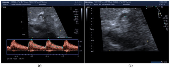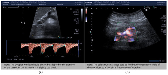 The insonation angle refers to the angle between the vessel to be measured and the transducer. Common Hepatic Artery: The outflow of the AHC from the celiac trunk was identified in an upper abdominal cross-section. In this context, vascular variants of the arterial liver supply were sought, particularly with regard to an additional supply to the left lobe of the liver. In the case of an additional vessel, this circumstance was documented (about 5% of cases). However, the subjects were not excluded from the study. The Doppler gate was adjusted to the diameter of the vessel so that it covered about three-quarters of the lumen. It was positioned at least 1 cm from the origin of the AHC in a straight section of at least 2 cm and with as acute an angle as possible. The literature describes positioning the Doppler gate as close as possible to the origin. In our investigations, this position led to clearly different spectral patterns in the sense of the flow profile of the celiac trunk [12,17]. These ideal conditions could not always be fulfilled (Figure 3).