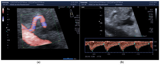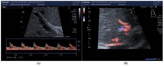 - Kubale, R.; Stiegler, H.; Weskott, H.P. Vascular Ultrasound: B-Mode, Color Doppler and Duplex Ultrasound, Contrast-Enhanced Ultrasound; Georg Thieme: Leipzig, Germany, 2023. [Google Scholar]