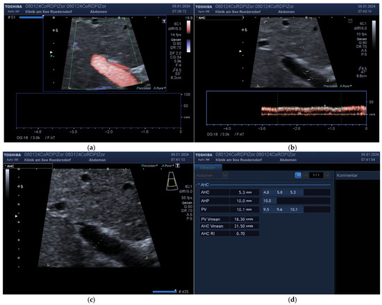 The following supporting information can be downloaded at: https://www.mdpi.com/article/10.3390/diagnostics14070778/s1, Figure S1: PV Bland-Altman plot for diameter; Figure S2: PV Bland-Altman plot for insonation angle; Figure S3: PV Bland-Altman plot for Doppler shift; Figure S4: PV Bland-Altman plot for blood flow; Figure S5: AHC Bland-Altman plot for diameter; Figure S6: AHC Bland-Altman plot for insonation angle; Figure S7: AHC Bland-Altman plot for Doppler shift; Figure S8: AHC Bland-Altman plot for blood flow; Figure S9: AHC Bland-Altman plot for Resistive Index; Figure S10: AHC Bland-Altman plot for DPI; Figure S11: AHP Bland-Altman plot for diameter; Figure S12: AHP Bland-Altman plot for insonation angle; Figure S13: AHP Bland-Altman plot for Doppler shift; Figure S14: AHP Bland-Altman plot for blood flow; Figure S15: AHP Bland-Altman plot for Resistive Index; Figure S16: AHP Bland-Altman plot for DPI.