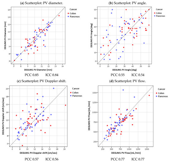 A total of n = 80 patients were included, and they were measured and evaluated by both investigators. The sample included 40 patients after CRC (14 men, 26 women, mean age 63.7 ± 11.7 years) and 40 patients after PDAC (21 men, 19 women, mean age 69.1 ± 8.9 years). Of all patients, 56.3% were female and 43.8% were male (p = 0.176). Patients in the pancreatic cancer group (PDAC) were significantly older with p = 0.017 (63.7 ± 11.7 years vs. 69.1 ± 8.9 years), while BMI was significantly higher in patients with colon cancer (26.1 ± 3.9 kg/m2 vs. 23.0 ± 4.7 kg/m2 with p = 0.001). There were no significant differences in total protein, while albumin was significantly higher in the CRC group (42.3 ± 5.0 g/L vs. 39.1 ± 3.9 with p = 0.001). For sonographic Doppler measurements, the insonation angle used is a known source of error. This angle should be as small as possible and not exceed a value of 60°. All measurements for which an angle greater than 60° was used were discarded. Consequently, not all 80 data pairs could always be used, and in such cases, the number of cases was lower.
