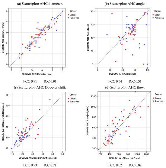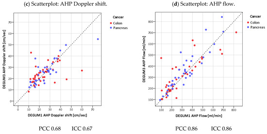 The scatterplots of the vessel diameters of all three vessels show very good agreement (vessel diameter PV: Pearson 0.85; ICC 0.84; AHC Pearson 0.91; ICC 0.91; AHP Pearson 0.81; ICC 0.81) (Figure 7, Figure 8 and Figure 9). The direct comparison of the paired values for insonation angle and Doppler shift shows only moderate agreement (insonation angle: PV Pearson 0.55; ICC 0.54; AHC Pearson 0.54; ICC 0.51; AHP Pearson 0.62; ICC 0.62; Doppler shift: PV Pearson 0.57; ICC 0.56; AHC Pearson 0.73; ICC 0.71; AHP Pearson 0.68; ICC 0.67) (Figure 7, Figure 8 and Figure 9). This shows the subjectivity of the examination. However, it would be a mistake to assume that this would also result in greater uncertainty of the calculated values. In fact, insonation angle and Doppler shift in pairs lead to repeatedly equal blood flows (blood flow PV Pearson 0.77; ICC 0.77; AHC Pearson 0.82; ICC 0.82; AHP Pearson 0.87; ICC 0.86) (Figure 7, Figure 8 and Figure 9).