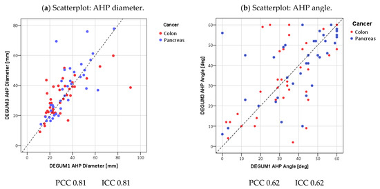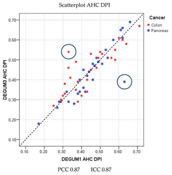 By following a strict protocol with respect to diameter and vessel type (artery or vein) in our study, the reproducibility of vessel diameters was excellent, especially with an emphasis on the leading edge method. The analysis of the agreement between the angle of insonation and the Doppler profile dependent on it shows the subjectivity of this examination. Here, the analysis showed a moderate agreement at best. Even if the anatomy of the individual remains unchanged, the experienced examiner adjusts the probe in such a way that they can perform the most accurate measurement. This means that angles close to or above 60° should be avoided. In this study, measurements at an angle of over 60° were not evaluated. The primary goal of each measurement was to obtain a good spectral pattern (at as acute an angle as possible) in a controlled manner. Our measurements were time-consuming and sometimes took up to 45 min per session. Under these conditions, particularly after pancreatic head resection, intestinal gas cannot be accepted as an obstacle to the visualization of AHC or AHP. If the calculation of the blood flows (and, thus, the DPIs) is based on high-quality measurements, as in the case of our study, this is reflected in the excellent reproducibility achieved, with a PCC or an ICC of 0.9 or more.