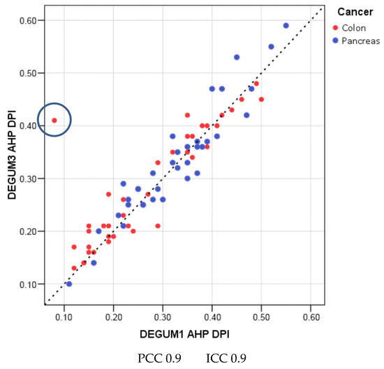 The scatterplots of the DPIs for AHC and AHP calculated from the blood flows show very good reproducibility (DPI AHC: Pearson 0.87 ICC 0.87; AHP: Pearson 0.9 ICC 0.9) (Figure 10 and Figure 11).