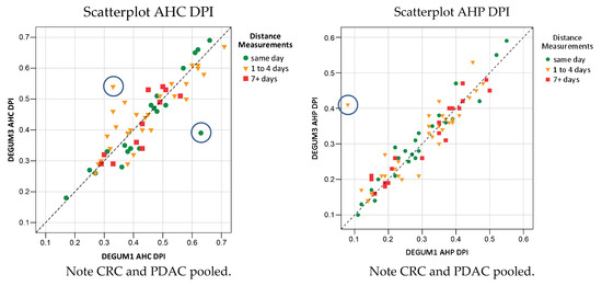 Most of the test subjects were not seen by the two investigators on the same day. The two measurements (DEGUM 1 and DEGUM 3) were, therefore, carried out from 0 to 30 days apart. In addition, the DEGUM 1 measurements were mainly performed early in the morning and the DEGUM 3 measurements mostly at midday. This raised the question of whether the time of day, on the one hand, and the time interval in particular, had an influence on the reproducibility of the measurement data. The measurement data were categorized into the following groups: measurement on the same day (Figure 12, green), measurement at an interval of 1 to 4 days (Figure 12, orange), and measurement at an interval of 7 or more days (Figure 12, red). No subjects were measured with a time interval of 5 or 6 days.