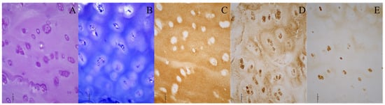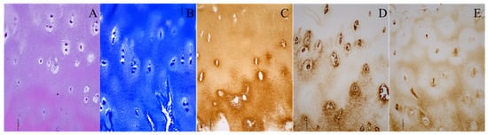 The immunohistochemical analysis for collagen types II and VI and aggrecan was performed. Slides were deparaffinized in xylene and rehydrated in ethanol. Antigen retrieval for collagen type II was performed using pronase (P8811, Sigma-Aldrich, Taufkirchen, Germany) and hyaluronidase (H3506, Sigma-Aldrich, Taufkirchen, Germany). Antigen retrieval for collagen type VI was performed with overnight incubation in a citrate buffer (pH 6.2). Antigen retrieval for aggrecan was performed with overnight incubation in a citrate buffer (pH 6.2) and subsequent incubation in dithiothreitol (707265ML, Thermo Fisher Scientific, Rockford, IL, USA) and iodoacetamide (A39271, Thermo Fisher Scientific, Rockford, IL, USA). Blocking was performed with 10% goat serum (G9023, Sigma-Aldrich, Taufkirchen, Germany). Samples were incubated with anti-collagen type II (II-II6B3-s, 1:8000, Developmental Studies Hybridoma Bank, Iowa City, IA, USA), anti-collagen type VI (ab199720, 1:1000, Abcam, Cambridge, UK), and anti-aggrecan (12/21/1-C-6-s, 1:150, Developmental Studies Hybridoma Bank, Iowa City, IA, USA) primary antibodies overnight, at 4 °C. Negative control samples were incubated with 1% goat serum. The signal was visualized using the Dako REAL EnVision Detection System (K500711-2, Agilent Technologies, Santa Clara, CA, USA), according to the manufacturer’s instructions. Following covering and drying, the slides were examined under the microscope (CX33, Olympus, Tokyo, Japan) and photographed with the accompanying digital camera (EP50, Olympus, Tokyo, Japan). The level of antigen expression was assessed in terms of saturation levels utilizing ImageJ software (v2.3.0., National Institutes of Health, Bethesda, MD, USA). Saturation was measured on a scale from 0 to 100%, with 0% indicating no detected signal and 100% indicating 100% saturation, i.e., the observed area was completely stained. All measures were normalized to the negative control to eliminate the effect of background staining. The saturation of each sample expressed as % was divided by the saturation of the negative control expressed as %, resulting in a number (no unit) representing the level of expression of each antigen.