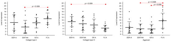 Statistically significant differences between the levels of expression of aggrecan were found between DDH NA and Fx A (p = 0.006), OA A and Fx A (p = 0.006), and Fx A and Fx F (p < 0.001).