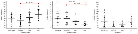 The level of expression for collagen type II, collagen type VI, and aggrecan of the femoral head cartilage of the non-weight-bearing part of the femoral head of developmental dysplasia of the hips-induced osteoarthritis group (DDH NWB), the weight-bearing part of the femoral head of developmental dysplasia of the hips-induced osteoarthritis group (DDH WB), weight-bearing part of the femoral head of the primary osteoarthritis group (OA F), and weight-bearing part of the femoral head of femoral neck fracture group (Fx F). Black dots represent single measurements, while average saturation ± SD is depicted with black lines. Statistical significance is shown on plots with red dots and lines (p < 0.05, Mann–Whitney test).
