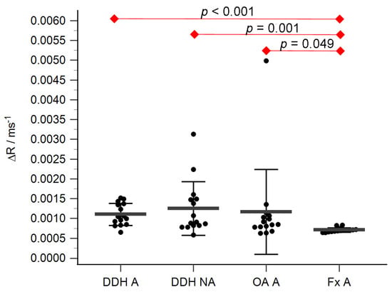 ΔR values of the acetabular cartilage of anatomical acetabulum of developmental dysplasia of the hips-induced osteoarthritis group (DDH A), neoacetabulum of developmental dysplasia of the hips-induced osteoarthritis group (DDH NA), acetabulum of the primary osteoarthritis group (OA A), and acetabulum of femoral neck fracture group (Fx A). Black dots represent single measurements, while average saturation ± SD is depicted with black lines. Statistical significance is shown on plots with red dots and lines (p < 0.05, Mann–Whitney test).