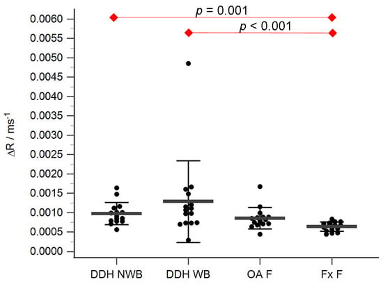 ΔR values of the femoral head cartilage of the non-weight-bearing part of the femoral head of developmental dysplasia of the hips-induced osteoarthritis group (DDH NWB), the weight-bearing part of the femoral head of developmental dysplasia of the hips-induced osteoarthritis group (DDH WB), weight-bearing part of the femoral head of the primary osteoarthritis group (OA F), weight-bearing part of the femoral head of femoral neck fracture group (Fx F). Black dots represent single measurements, while average saturation ± SD is depicted with black lines. Statistical significance is shown on plots with red dots and lines (p < 0.05, Mann–Whitney test).