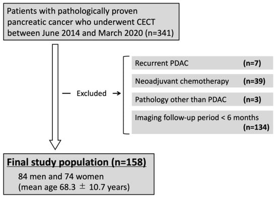 This single-center, retrospective study was approved by the Institutional Review Board of our institute. The requirement for obtaining informed consent was waived owing to the retrospective nature of the study. We searched the pathological database of our institution between June 2014 and March 2020 and identified 341 patients with pathologically confirmed pancreatic cancer. The inclusion criteria were as follows: (a) patients with pathologically confirmed PDAC, (b) patients who underwent pretreatment CECT, (c) patients without a history of pancreatic surgery prior to the pretreatment CECT, (d) patients without a history of neoadjuvant chemotherapy prior to the surgery, (e) patients who had more than 6 months of follow-up after the pretreatment CECT. Patients with recurrence of PDAC after surgery (n = 7), patients receiving neoadjuvant chemotherapy (n = 39), patients with pathologies other than PDAC (n = 3), and patients with inadequate imaging follow-up (follow-up duration of <6 months, n = 134) were excluded. Thus, 158 patients, comprising 84 men and 74 women with a mean age of 68.3 ± 10.7 years, were included in the analysis (Figure 1).