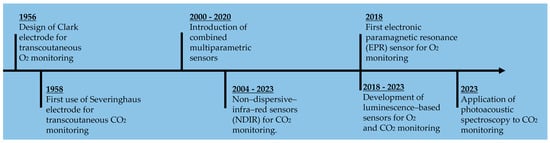 Timeline of oxygen and carbon dioxide sensors for transcutaneous gas monitoring.