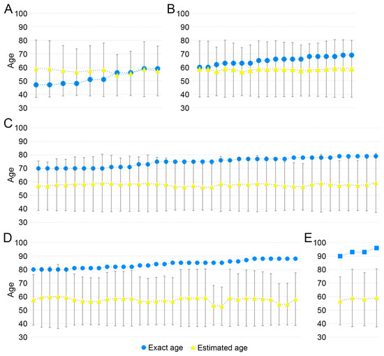 Exact age and estimated age using SAH score prediction equation. Exact age (blue circle) and estimate age (yellow triangle) via SAH score prediction equation of (A) 40 to 50s, (B) 60s, (C) 70s, (D) 80s, and (E) 90s samples. The error bars of the estimated age show the prediction age range (k = 2).