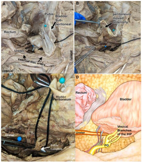 First, four formalin–phenol-fixed cadavers were examined intact using an open abdominal and anterior pelvic approach (Table S1). A representative cadaver is shown in Figure 1A–C. The bladder was retropubic and sub-peritoneal in location (Figure 1A). After reflection of the peritoneum (Figure 1B) and elevating the bladder in an antero-medial direction (Figure 1C), vesical branches of the IHP and pelvic ganglion could be visualized (Figure 1C,D). The location of the vesical branches of the IHP was posterolateral to the ureter at the ureteral orifice in this cadaver (Figure 1C).