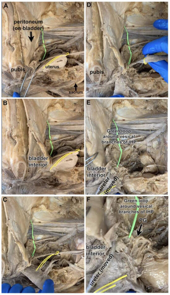Figure 2A–C shows a hemisected pelvis in which the bladder is viewed looking lateral to medial (the cut pubis, sacrum, and uterus are labeled as landmarks; the ureter is looped with a yellow vessel loop). The bladder was left attached to the pubis in its subpubic position, although opened for bladder verification (Figure 2B). The uterus and ureter were reflected to visualize the structures posterior to the ureter (Figure 2C–E). After these reflections, two vesical branches of the IHP could be identified posterolateral to the ureter’s entrance into the bladder (green loop; Figure 2E,F). These vesical branches arose from an enlarged and nearby pelvic ganglion (Figure 2F). In this cadaver, the location of the vesical branches of the IHP was lateral to the bladder and posterolateral to the ureter at the ureteral orifice. These same structures are shown as diagrams in Figure 3A–F.