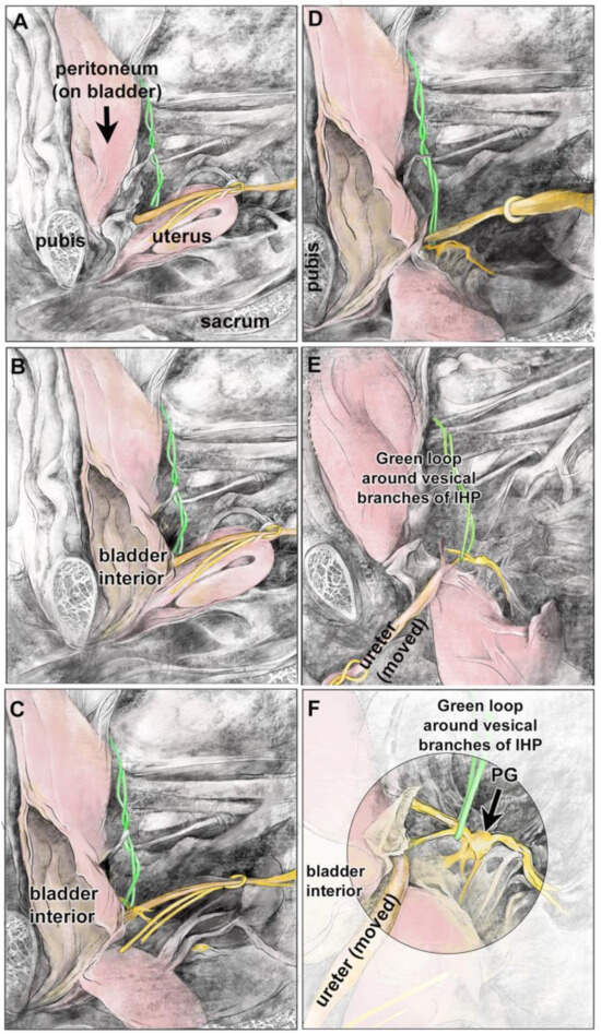 A hemisected pelvis showing a retropubic and sub-peritoneal bladder, and vesical branches of the IHP and pelvic ganglion (PG). The sacrum demarks the posterior vertebral column, while the pubis demarks the anterior medial boundary of the pelvis. The top of each image is cranial spatially in the cadaver. (A) Hemisected pelvis with several landmarks indicated: pubis, peritoneum-covered bladder, uterus, ureter (yellow loop), and sacrum. Vesical branches of the IHP are not yet visible (green loop). (B) The bladder is opened to reveal its interior. (C) The uterus is reflected towards the sacral vertebra. Ureter is delineated by a yellow loop; vesical branches of IHP are delineated with a green wire. (D) The uterus is reflected out of the field; the ureter is being reflected. (E) With their reflection, vesical branches of the IHP are now visible (green wire). (F) Enlargement of image in panel (E). Vesical branches are delineated by a green wire. The pelvic ganglion (PG) is labeled (large black arrow).