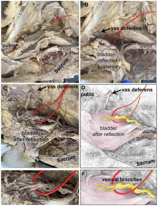 A hemisected pelvis from a male showing a retropubic bladder, and two vesical branches of the IHP. The sacrum demarks the posterior vertebral column, while the pubis demarks the anterior medial boundary of the pelvis. The top of each image is cranial spatially in the cadaver. (A) Hemisected pelvis with several landmarks indicated: pubis, bladder, ureter, sectioned sacral vertebra (sacrum). The vesical branches of the IHP are not yet visible (red loop). (B) The bladder was reflected. (C) With the reflection of the bladder, two vesical branches of the IHP are now visible (red wire). (D) Diagram of the photograph shown in panel (D). (E) Enlargement of image in panel (C). Two main vesical branches are delineated by a red wire, with an additional branch coming from one of the main branches. (F) Diagram of the photograph shown in panel (E).