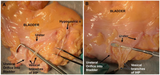 Figure 5 shows the vesical branches of the IHP in an unfixed cadaver’s bladder after removal of the bladder. On both the right and left sides, the vesical branches were identified posterior to the ureter on the lateral side of the base of the bladder. Two main vesical branches were identified before their subsequent further branching to the ureter and bladder wall (Figure 5A,B). Also, on each side of this bladder, prior to further branching, the main trunk of the vesical branch(es) was located near the ureteral orifice (Figure 5A,B). The hypogastric nerve was also visualized on the upper portion of the bladder, ascending to the bladder apex (Figure 5A).