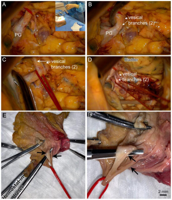 Figure 6A–D shows representative images of these structures from a cadaver captured using an intra-operative camera during a robotic-assisted laparoscopic procedure. During this procedure, the ureter was used as a key landmark. When located, the ureter was followed to the bladder. At that point, Figure 6C,D shows two vesical branches of the IHP arising from this pelvic ganglion. The vesical branches of the IHP were demarcated with red vessel loops in laparoscopic-dissected cadavers. The bladders were resected with the nerves and associated soft tissue en bloc. Figure 6E,F depict one of these resections with the red vessel loop still around the vesical branches of the IHP. Two vesical branches were identified.