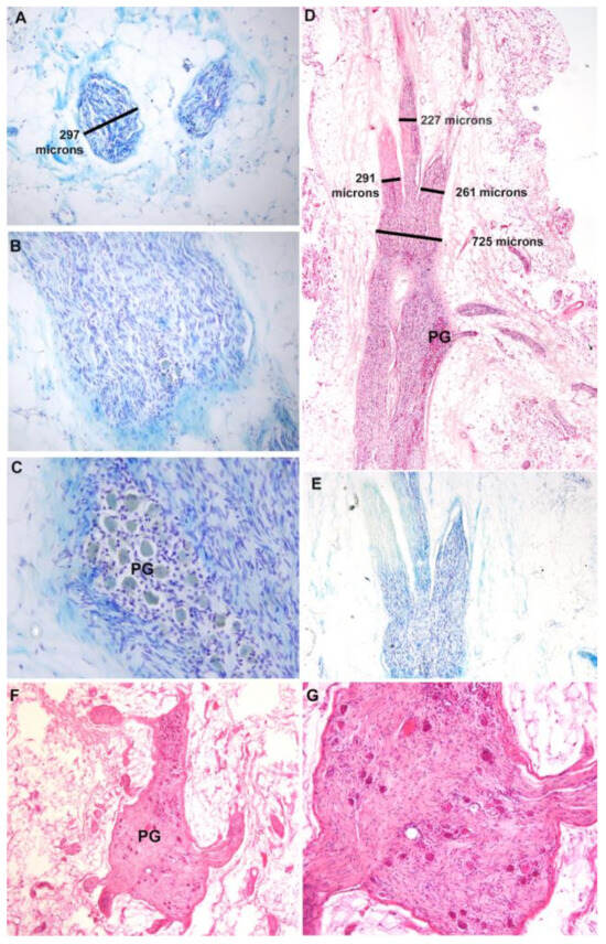 Histological images of vesical branches and pelvic ganglia (PG). (A–C) Sequential sections showing two distal vesical branches in panel A, a slightly more proximal section of the same nerve showing the presence of a few neuronal cell bodies (arrows) in panel (B), and a section through the pelvic ganglion (PG) of this same nerve, showing the presence of neuronal cell bodies in panel (C). Luxol blue staining. (D,E) Vesical branches and pelvic ganglia of a different cadaver stained with hematoxylin and eosin (D) and Luxol blue. Three vesical branches exit distally from the pelvic ganglion enlargement in this cadaver. (F) A section through a pelvic ganglion showing nerve branches and presence of neuronal cell bodies. (G) Enlargement of image shown in panel F. Scale markings in panels (A,D) relate also to panels (B,C,E,F).