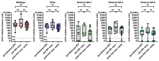 Baseline levels of binding inhibition between ACE and RBDs of different SARS-CoV-2 variants as assessed by the multivariant sVNT. The y-axis displays the levels of binding inhibition between angiotensin-converting enzyme 2 (ACE2) and the receptor-binding domains (RBD) of the SARS-CoV-2 wildtype, the Delta variant, and the Omicron subvariants BA.1, BA.2, and BA.5 in arbitrary units (calibrated to represent NT titers). These levels were compared among PLWH who were vaccinated three times with a monovalent mRNA vaccine, who subsequently acquired Omicron BTI, who received a fourth dose of the monovalent mRNA vaccine, and who were neither infected with SARS-CoV-2 nor vaccinated a fourth time. Comparisons were performed using the Wilcoxon matched pairs test (ns p ≥ 0.05). The cutoff for the sVNT was 10 arbitrary units for all variants, respectively. Abbreviations: BTI: breakthrough infection; ns: not significant.