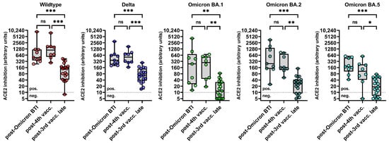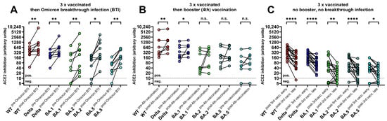 Levels of binding inhibition between ACE and RBDs of different SARS-CoV-2 variants post-booster vaccination, post-BTI, and late during follow-up. The y-axis displays the binding inhibition between angiotensin-converting enzyme 2 (ACE2) and the receptor-binding domains (RBDs) of the SARS-CoV-2 wildtype, the Delta variant, and the Omicron subvariants BA.1, BA.2 and BA.5 in arbitrary units (calibrated to represent NT titers). The median level (columns) and individual levels (dots) of ACE2-RBD-binding inhibition are shown as assessed by the sVNT in the three-times vaccinated PLWH (monovalent mRNA vaccines) from (1) group A after they acquired breakthrough infection (BTI) with an Omicron variant (“post-Omicron BTI”), (2) group B after they received a fourth dose of the monovalent WT vaccine (“post-booster”), and (3) group C who were neither vaccinated a fourth time nor infected late after the third vaccination (“post-3rd vacc. late”). Comparisons were performed using the Kruskal–Wallis test and Dunn´s multiple comparison tests. The cutoff for the sVNT was 10 units for all variants respectively. Abbreviations: BTI: breakthrough infection; (*** p < 0.001, ** p < 0.01, * p < 0.05, ns p ≥ 0.05). Abbreviations: BTI: breakthrough infection; vacc.: vaccination; ns: not significant.