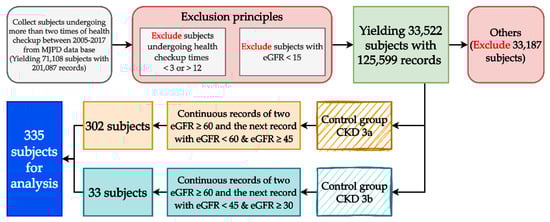 This study constructed the longitudinal variables and their data by using each subject’s first two examination results to predict their third CKD examination results. We collected subjects’ 12-year examination records (from 2005 to 2017). Consistent with the prediction goals and conversion principles of the longitudinal data (each subject completed one examination annually), we excluded subjects with less than 3 or more than 12 examination records, leaving 33,533 subjects (125,641 health examination records). The data may include patients on dialysis, and they were not within the scope of this study, so we excluded 11 subjects whose estimated glomerular filtration rate (eGFR) was below 15 (42 records in total), leaving 33,522 subjects (125,599 records). We grouped these subjects based on the definition and eGFR criterion of CKD into an experimental group, a control group, and an “others” group. The experimental group comprised subjects with two consecutive eGFR values ≥60 in their health examination records; in total, 33 subjects met the definition of stage 3a CKD as their eGFR was ≥30 and <45. The control group comprised 302 subjects who met the definition of stage 3b CKD. The remaining 33,187 subjects were placed in the others group as they did not meet the criteria for the experimental or control group. After a multiphase processing of all subjects’ data, there were 335 eligible subjects. The process of identifying the longitudinal subjects is shown in Figure 1.