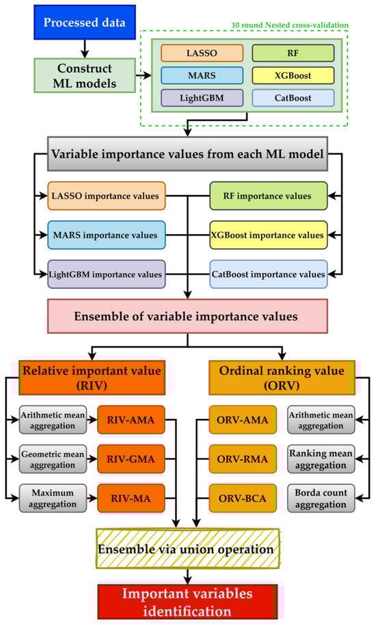 Because a single selection variable algorithm has the propensity to choose a locally optimal solution, the ensemble variable has more opportunities to better approximate the optimal solution by averaging different assumptions [37]. To derive more stable results, different VER approaches are considered. VER approaches can provide more robust variable selection results than a single variable selection method and reduce bias and variance. It has shown excellent results across various research domains [38,39]. Hence, MA, AMA, GMA, BCA, and RMA are used in this study as they are widely utilized in many studies [37,40]. Moreover, because different VER approaches are only applicable to a specific variable measurement scale, the RIV variable integration is based on MA, AMA, and GMA, whereas ORV is based on AMA, BCA, and RMA. The equations of each VER approach used are as follows: