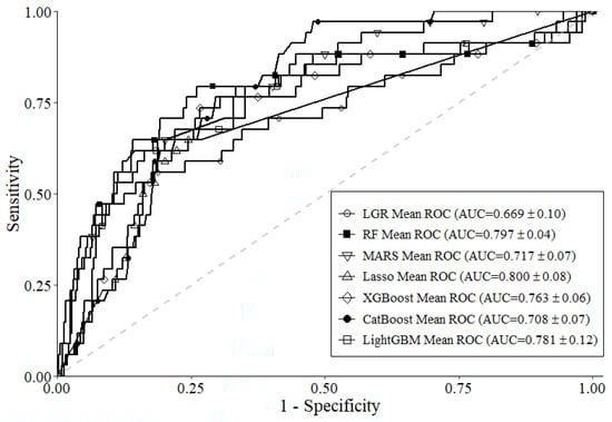 This study used the R programming language (version 4.0.5; http://www.R-project.org (accessed on 27 February 2024)) and RStudio software (version 1.1.453; https://www.rstudio.com/products/rstudio/ (accessed on 27 February 2024)) to construct an effective ML model. All of the algorithm equations and estimated optimal hyperparameters of the models were built using R-related software packages. The package information is as following: The RF, LGR, MARS, Lasso, XGBoost, CatBoost, and LightGBM models were created using the randomForest (version 4.7-1.1) [41], stats (version 4.0.5), earth (version 5.3.1) [42], glmnet (version 4.1-7) [43], xgboost (version 1.6.0.1) [44], catboost (version 0.25.1) [45], and lightgbm (version 3.3.2) [46] packages, respectively. Lastly, the optimal hyperparameters were estimated for all models using the caret package (version 6.0-93) [47].