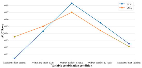 Figure 4 shows the AUC values of Lasso using different variable combination conditions with RIV and ORV. As shown in the figure, both RIV and ORV have increasing AUC values from the condition within the first four rankings to within the first eight rankings, and then both of their AUCs begin to decrease. ORV has better performance in AUC than RIV when the conditions are within the first four rankings and within the first six rankings; after that, RIV is superior to ORV in AUC when the amount of variables increases. In summary, the stability of the union operation is confirmed, and it indicates that the proposed risk factor evaluation scheme of this study can provide promising results.