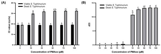 Ct values (A) and dCt (B) of DNA from viable and dead S. Typhimurium after PMAxx treatment at varying concentrations. Different capital letters indicate significant differences (p < 0.05) between the Ct values. Different lowercase letters indicate significant differences (p < 0.05) between dCt values.