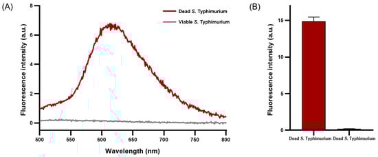 Viable and dead S. Typhimurium at 1.11 × 108 CFU/mL were treated with the optimized PMAxx conditions. Subsequently, 200 μL of each solution was transferred to wells in a black 96-well plate (SPL, Pocheon-si, Republic of Korea), and the fluorescence intensity emitted was measured using a microplate reader (Varioskan LUX Multimode Microplate Reader, Thermo Fisher Scientific, Waltham, MA, USA). An emission spectrum ranging from 500 to 800 nm was recorded at an excitation wavelength of 450 nm. The fluorescence intensity was then measured at excitation and emission wavelengths of 510 and 610 nm, respectively. Saline (200 μL) was used as the blank.