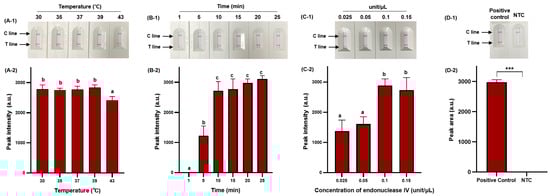 RPA-based NALF demonstrated amplification at all temperatures tested (30 °C, 35 °C, 37 °C, 39 °C, and 43 °C); however, a significant decrease (p < 0.05) in peak intensity was observed at 43 °C (Figure 4A-1,A-2). As the amplification temperature increases (>40 °C), enzyme activity may gradually decrease, and at lower temperatures, the amplification time of amplicons may exceed the rate of energy consumption, decreasing sensitivity [40,41]. Therefore, we set the optimal temperature at 39 °C to minimize the impact on amplification efficiency while ensuring effective amplification. The RPA reaction increased with amplicon quantity after 5 min, with no significant difference in peak intensity observed after 10 min (p > 0.05); however, the peak intensity gradually increased with extended amplification time (Figure 4B-1,B-2). Considering the variability in amplification time based on the initial template amount, a 25 min amplification time was selected to accommodate sensitive S. Typhimurium detection. The peak intensity of the RPA-based NALF system significantly differed based on the concentration of endonuclease IV, with maximum peak intensity at an endonuclease IV concentration of 0.1 unit/μL. A slight decrease in peak intensity was observed when 0.15 unit/μL of endonuclease IV was used and potentially attributed to miscleavage and unnecessary extension. Consequently, the optimal conditions for the RPA-based NALF system were determined to be incubation at 39 °C for 25 min with 0.1 unit/μL endonuclease IV. Positive and negative samples significantly differed (p < 0.001) between under optimized conditions (Figure 4D-2).
