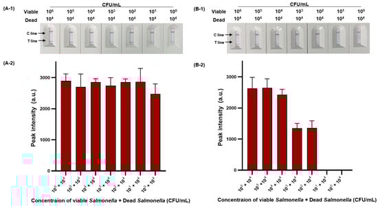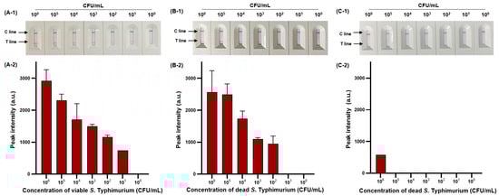 We then evaluated the sensitivity of viable and dead S. Typhimurium and verified the effect of PMAxx on dead S. Typhimurium (Figure 6). The detection limit for viable S. Typhimurium was 102 CFU/mL (Figure 6A-1,A-2), with only one positive result out of three replicates at a concentration of 101 CFU/mL, and for dead S. Typhimurium was also 1.11 × 102 CFU/mL (Figure 6B-1,B-2). However, after PMAxx treatment, interference from the DNA of dead S. Typhimurium was eliminated, producing a significant difference between the peak intensity for dead S. Typhimurium treated with and without PMAxx (Figure 6C-1,C-2). Furthermore, we evaluated the sensitivity by mixing dead S. Typhimurium at 104 CFU/mL with various concentrations (100–105 CFU/mL) of viable S. Typhimurium (Figure 7). Unprocessed RPA-based NALF showed difficulty in comparing peak intensities because of interference from the dead S. Typhimurium DNA (Figure 7A). Conversely, after PMAxx treatment, the detection limit was 102 CFU/mL (Figure 7B), similar to that for viable S. Typhimurium shown in Figure 6A-1,A-2, indicating the effective suppression of dead S. Typhimurium DNA amplification and enabling the detection of only viable S. Typhimurium.