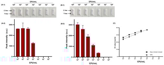 We evaluated the detection performance of PMAxx-RPA-based NALF by comparing the sensitivity in food samples. The sensitivity to viable S. Typhimurium (100–106 CFU/mL) artificially inoculated into milk and raw chicken breast is shown in Figure 8A-1,A-2,B-1,B-2. The detection limit was 4.44 × 103 and 5.9 × 102 CFU/mL for raw chicken breast and milk, respectively. The proposed method was compared with the sensitivity and reliability of real-time PCR as the detection standard for foodborne pathogens, confirming the same detection limit of 4.44 × 103 and 5.9 × 102 CFU/mL for raw chicken breast and milk, respectively (Figure 8C).