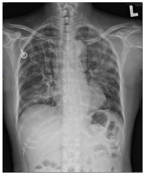 Chest X-ray showing marked pneumonitis patches, demonstrating increasing bilateral lung infiltration.