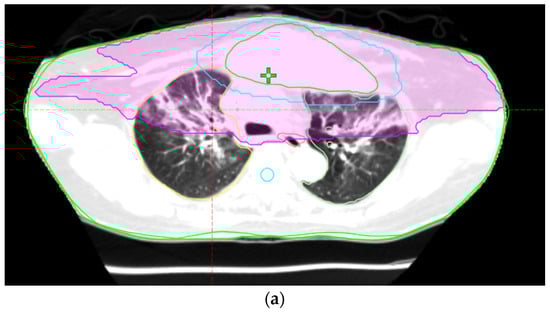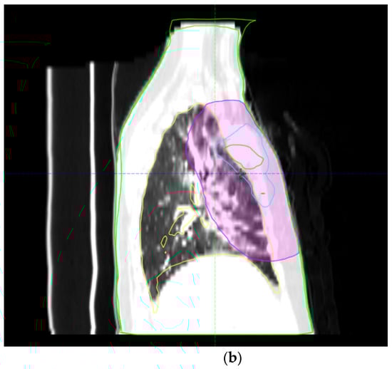 (a,b) Axial and sagittal views of a chest CT scan illustrating severe radiation pneumonitis. The images feature a fusion of radiotherapy isodose lines with the CT scan, highlighting areas where pneumonitis patches coincide with the isodose lines. The purple line represents the 20 Gy isodose line, and the sky-blue line represents the 42 Gy isodose line, indicating the direct impact of radiation dose distribution on lung tissue.