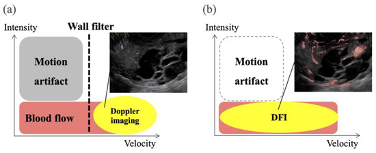 Schema of eFLOW and detective flow imaging (DFI). (a) eFLOW reduces motion artifacts and low-flow vessels using a wall filter. (b) DFI enables the detection of low-flow vessels while reducing motion artifacts.