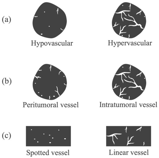 Diagnostic criteria for DFI. (a) Vascularity was classified as hypovascular or hypervascular. (b) Vessel distribution was classified as peritumoral or intratumoral. (c) Vessel shape was classified as spotted or linear.