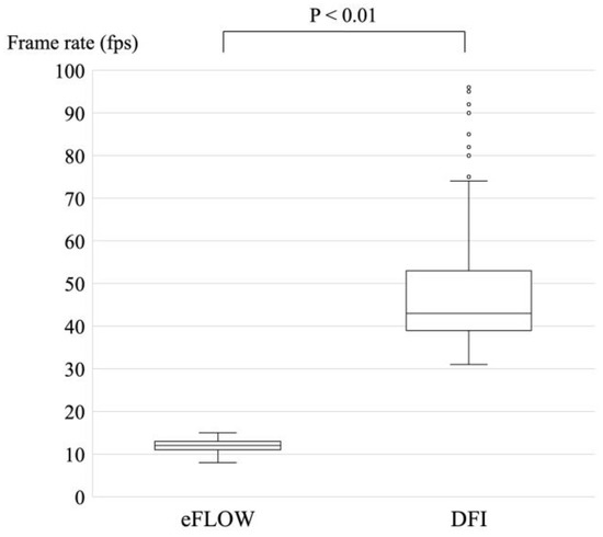 The frame rate was set as 20 frames per second (fps) for B-mode; in contrast, the frame rate was automatically modified according to the size of the ROI for eFLOW and DFI. Each frame rate was recorded and analyzed retrospectively (Figure 3). The median (range) of frame rate for DFI was significantly higher than that for eFLOW (43 [31–96] fps vs. 12 [8–15] fps; p < 0.01).