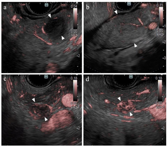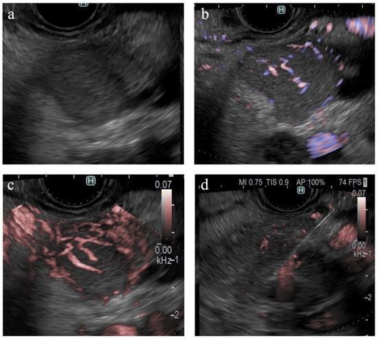 Most lesions are visualized as hypoechoic masses in B-mode EUS, and the dilation of the main pancreatic duct is insufficient for diagnosing pancreatic cancer [10]. Contrast-enhanced computed tomography (CT) is used for the diagnosis of SPLs [2,11]; however, EUS has not been applied for the vascular evaluation of SPLs. Although Doppler imaging provides information regarding the major vessels surrounding the pancreas [12], the details of minute vessels within the SPLs cannot be obtained via this modality [13].
