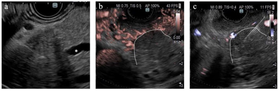 A case of pancreatic cancer. (a) On B-mode, the main pancreatic duct is obstructed in the pancreatic head (*); however, the tumor margin is unclear. (b) On DFI, the tumor margin is detectable because of the interruption of vessels in the pancreatic parenchyma. (c) Endoscopic ultrasound-guided tissue acquisition was successfully performed according to the margin on DFI.