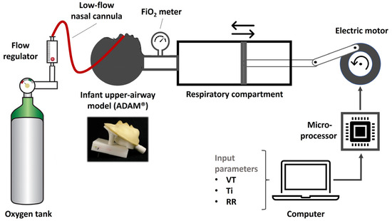 A mechanical infant breathing simulator (Figure 2) was developed as described in the GitHub repository: https://github.com/arisberd/Infant-breath-mechanical-simulator (accessed on 2 March 2024). Briefly, the lung simulator consisted of a single-space breathing compartment (100 mL Hans Rudolph calibration syringe, model 5510, Hans Rudolph Inc., Kansas City, MO, USA) connected to an ADAM infant upper-airway replica [13]. The replica was slightly modified by cutting the airway at the glottis level to reduce excess (subglottic) dead space. The volume of the replica’s air passages was subsequently measured by a water displacement method (10 consecutive measurements) and found to be 5.2 ± 0.1 mL. A pliant plastic rod (diameter 5 mm, length 50 mm, volume 1 mL) was introduced to the replica’s air passages to reduce dead space when the simulated VT was <10 mL. Conversely, an expandable tube was placed between the ADAM model and the breathing compartment to increase the dead space volume of the upper airways accordingly [14] when the simulated VT was >50 mL. The syringe’s piston was connected to a stepper motor (Jiangsu Wantai Motor Co., Changzhou, China) controlled using an Arduino Uno R3 board [15]. Breathing simulations, based on various VT, Ti, and RR combinations (see below), were set in a personal computer and uploaded to the Arduino microcontroller. The FiO2 was measured at the tip of the syringe using an AΧ300 oxygen analyzer (Teledyne, City of Industry, CA, USA). The analyzer was calibrated at the beginning of each cycle of simulations and every two hours of operation. A commercially available neonatal/infant-sized LFNC was mounted on the ADAM model according to our setting guidelines. The LFNC was connected to a Debson TM2 flowmeter (Technologie Medicale, Noisy Le Sec, France; flow range 0.1–1 L/min, 0.1 L/min resolution) supplied with 100% oxygen from an oxygen tank.