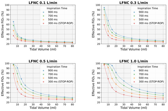 More precisely, at a cannula flow of 0.1 L/min and for a VT of 5 mL, the FiO2 was 65.7 ± 0.2% for a Ti of 900 ms, 57.8 ± 0.2% for a Ti of 700 ms, 47.4 ± 0.2% for a Ti of 500 ms, and 36.8 ± 0.1% for a Ti of 300 ms. At the same cannula flow and for a VT of 10 mL, the FiO2 was 40.1 ± 0.2% for a Ti of 900 ms, 36 ± 0.1% for a Ti of 700 ms, 32 ± 0.1% for a Ti of 500 ms, and 29 ± 0.1% for a Ti of 300 ms, while, for a VT of 40 mL, the FiO2 values were 26.2 ± 0.1%, 25.3 ± 0.1%, 24.5 ± 0.1%, and 23.6 ± 0.1%, respectively. For a VT of 50 mL, the effective FiO2 ranged between 23.2% and 25.4%, for a VT of 60 mL, between 22.7% and 24.9%, for a VT of 70 mL, between 22.5% and 24.5%, and for a VT of 80 mL, between 22.4% and 23.8% (Figure 3). On the other hand, at a cannula flow of 1.0 L/min and for a VT of 5 mL, the FiO2 was 98.9 ± 0.2% for a Ti of 900 ms, 97.8 ± 0.2% for a Ti of 700 ms, 98.6 ± 0.2% for a Ti of 500 ms, and 96.8 ± 0.2% for a Ti of 300 ms. At the same cannula flow and for a VT of 10 mL, the FiO2 was 98.2 ± 0.2% for a Ti of 900 ms, 97.8 ± 0.2% for a Ti of 700 ms, 91.7 ± 0.2% for a Ti of 500 ms, and 68.4 ± 0.2% for a Ti of 300 ms, while, for a VT of 80 mL, the FiO2 values were 37.4 ± 0.1%, 34 ± 0.1%, 30.4 ± 0.1%, and 27.1 ± 0.1%, respectively (Figure 3).