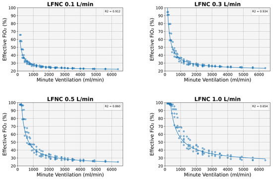 Minute ventilation emerged as the most significant predictor of effective FiO2 in all experiments; a power function (FiO2(MV) = 21 + k·MV−a) could most accurately describe the relationship between FiO2 and MV (Figure 4). This relationship was stronger at lower cannula flows (R2 0.9 at 0.1 and 0.3 L/min) but deteriorated significantly at higher flow values (R2 0.860 at 0.5 L/min and 0.654 at 1 L/min) (Figure 4).